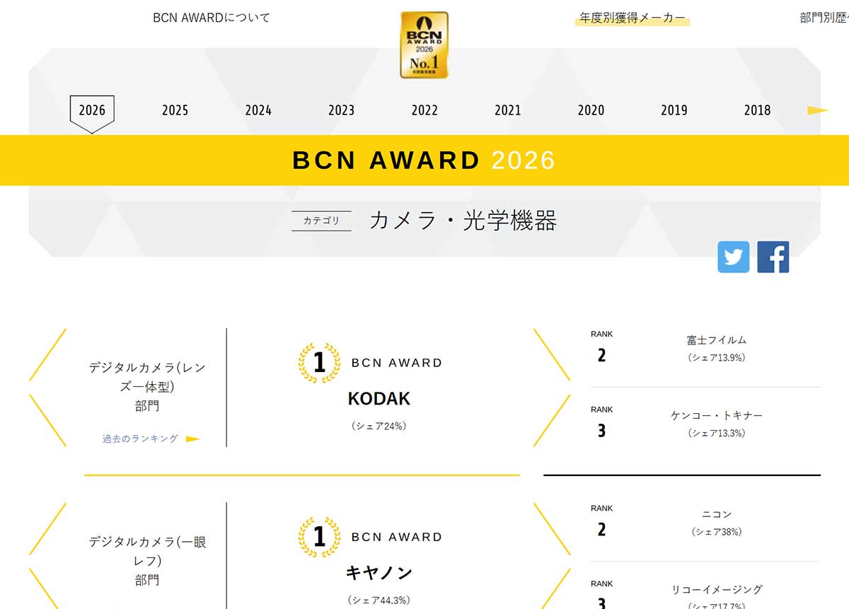 「BCN AWARD」は、全国の量販店・専門店・ネットショップの実売データから、年間販売数量No.1メーカーを表彰する制度だ。 2025年の年次集計では、レンズ一体型はKODAK、デジタル一眼レフはキヤノン、ミラーレスはソニーが首位。映像系はDJIが強く、交換レンズはタムロン、三脚・バッグはハクバ写真産業がトップとなった。