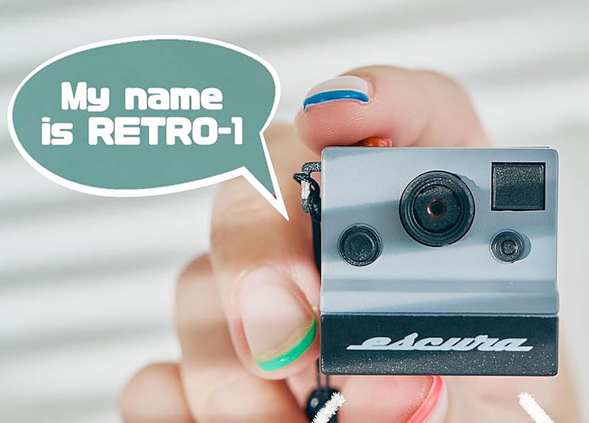 2000万画素のミニカメラ「retroCUBE(レトロキューブ)」。ワイヤレスイヤホンのケースと同等のコンパクトサイズで、自撮り向けのインカメラも搭載。