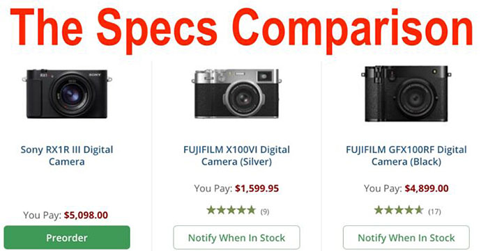 Sony RX1rIII vs Fujifilm GFX100RF vs X100VI Specs Comparison - GFX100RF Looking Like a Bargain and X100VI Like a Steal? - Fuji Rumors