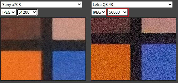 - ISOを51200まで上げても、「Leica」は色情報をしっかり保っているのに対し、「Sony」はカラーブロックが崩壊し、ノイズが顕著となる。