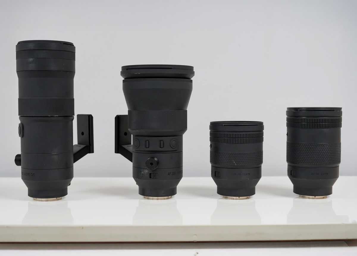 - 望遠レンズのモックアップ。「AF 200mm F1.8 FE」、「AF 300mm F4 FE」。
